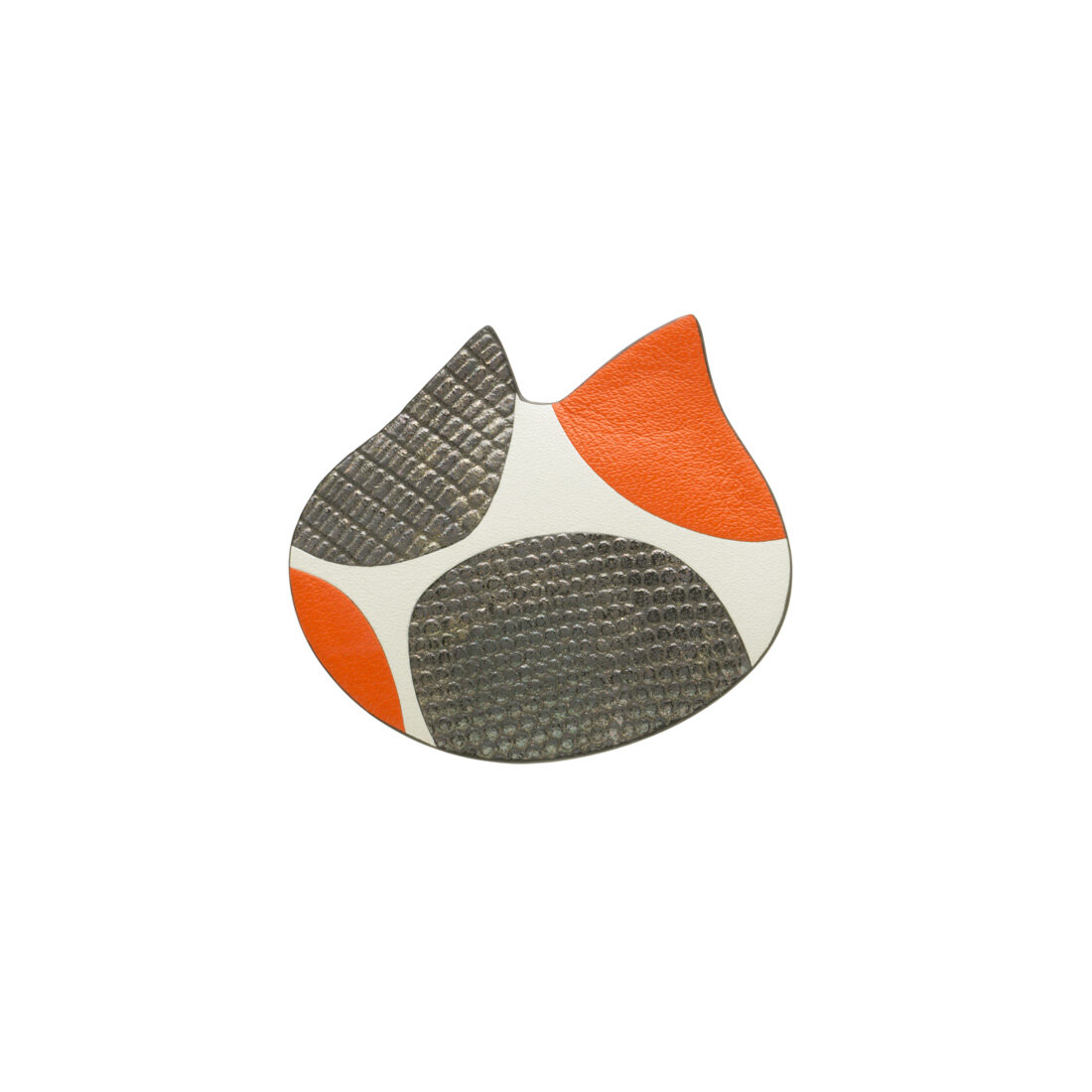 黒革に明度の違う2種類の銀色粉で光飛蒔絵を施した革ブローチ ミャオ のご紹介です。坂本これくしょんの牛革バッグ・財布などに施した蒔絵の技術を生かして作り上げた革のアクセサリー。ご好評いただいている「レザーペンダントブローチ ミャオ」シリーズから、「水玉 オレンジ色」を初めてご紹介。猫のカタチに仕上げたブローチは、オレンジ革と白革、型押しの革にいぶし銀箔の蒔絵をほどこした3種類の牛革を組み合わせて模様を作っています。型押しの革はそれぞれ表情が違うので、1つ1つがオリジナル。猫によって模様や形が違うように1匹1匹の違いをお楽しみください。わくわくする夢のあるデザインは身につけることで癒されたいと考える、忙しくアクティブな女性の心をしっかりとつかむ大人可愛いアイテムです。マドマドこれくしょんのミャオシリーズの他のアイテムと合わせてお使いいただくのもおすすめです。カジュアルな日常使いや、華やかなお出かけシーンにもマッチし、オールシーズン活用できるアイテムです。