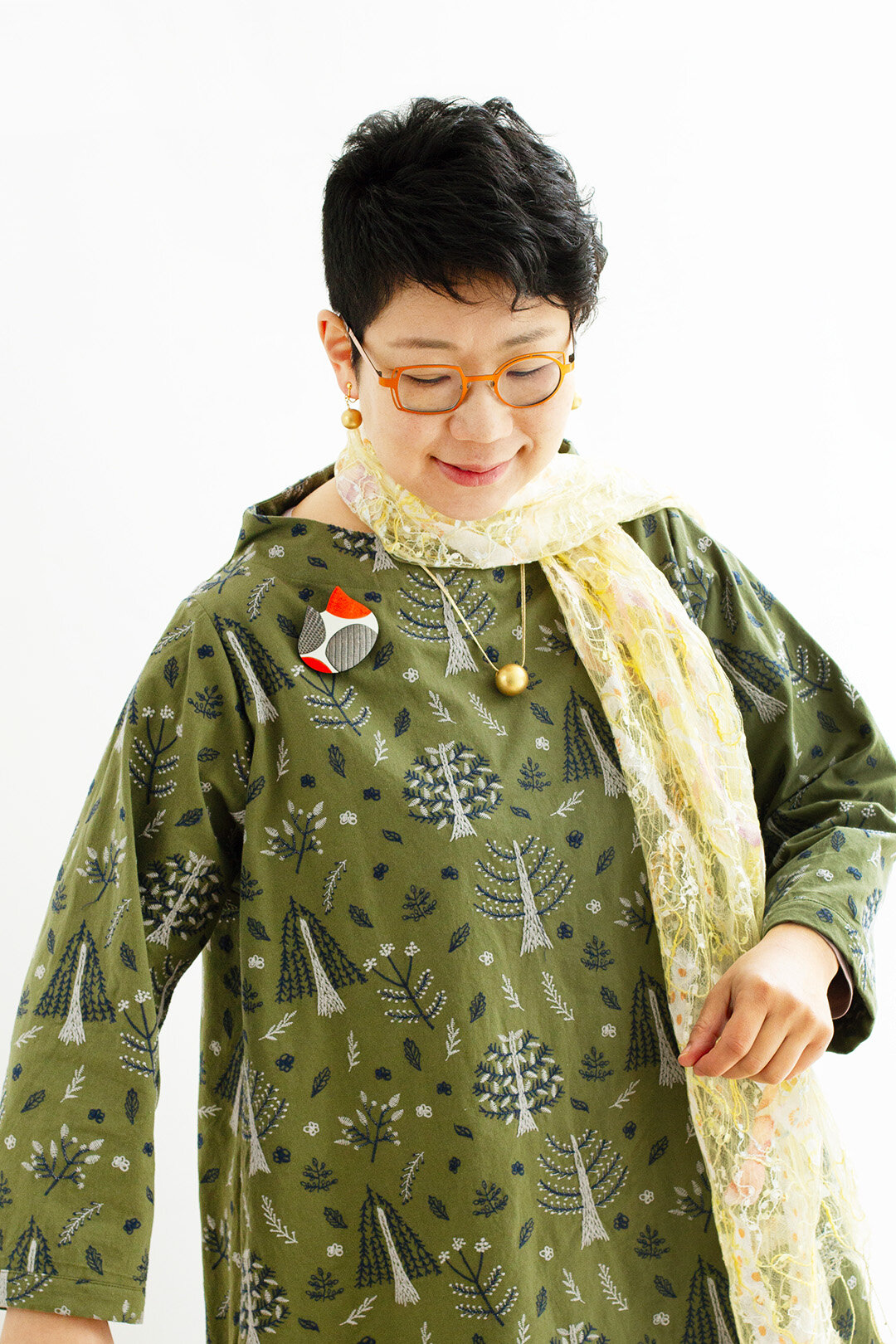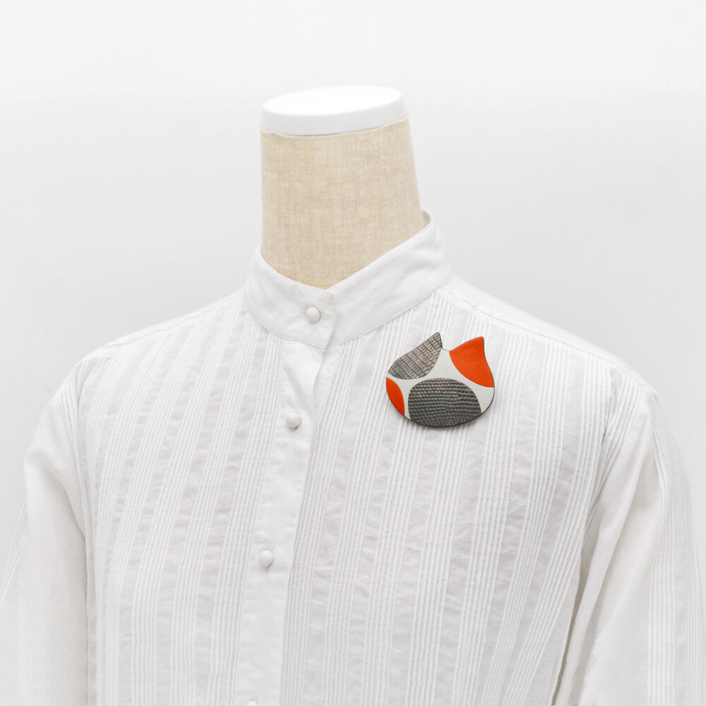 素材は牛革にプラチナ箔・銀色粉で仕上げられているので木製のアクセサリー同様とても軽く、体への負担が少なく楽に身に着けて頂けます。中にクッションを挟んで膨らみをもたせ、フチ処理を丁寧に仕上げることで立体感と高級感を感じられる作り。シルクなどの薄い素材のお洋服やカシミヤセーター、シフォンのスカーフ、プリーツなどにお使いいただいても、生地を傷めにくく、ブローチが下を向きにくいのもうれしい。蒔絵の技法を用いて専門の職人の手により一つ一つ丁寧に造られたブローチは、裏面に丸カンが1つ付いており、お手持ちのチェーンやコードを通してペンダントとしてもお使いいただけます。