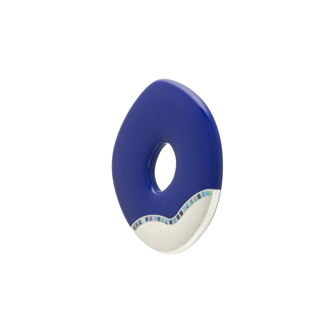 存在感がありながらも、コーディネイトがしやすい形のペンダントブローチは、お花をイメージしたふっくらとしたデザイン。中央に空間を開けたことによって、お洋服との一体感を楽しむことができます。お色は蒔絵の螺鈿の輝きがより映える、坂本これくしょんオリジナルの花紺色(はなこんいろ)で仕上げました。美しく神秘的な深みのあるブルーカラー、納得のいく青を表現するために何度も試作を経て作り上げたお色です。蒔絵のプラチナ箔はお花にそっと寄り添う葉っぱを、螺鈿は朝露をイメージしています。キラキラと輝き立体感を醸し出す螺鈿部分は、大きなアバローニシェル(あわび貝)からひとつひとつ切り出し、綺麗なグラデーションになるように考えながら手で置いていっています。遊び心のあるブローチながら、大人のシックな装いにもぴったりです。フォーマルなシーンからカジュアルな日常使いまでオールシーズン活用できます。お手持ちの当ブランドの同色アイテムや、他のアイテムとのコーディネイトを楽しむのもおすすめです。ご自分用はもちろん、大切な方へのギフトにもおすすめです。